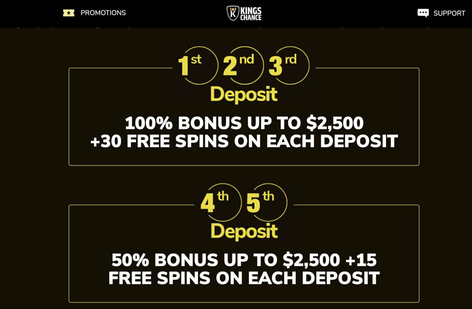 Réclamez vos bonus de bienvenue et vos tours gratuits au casino Kings Chance en cliquant sur le tableau ci-dessous :